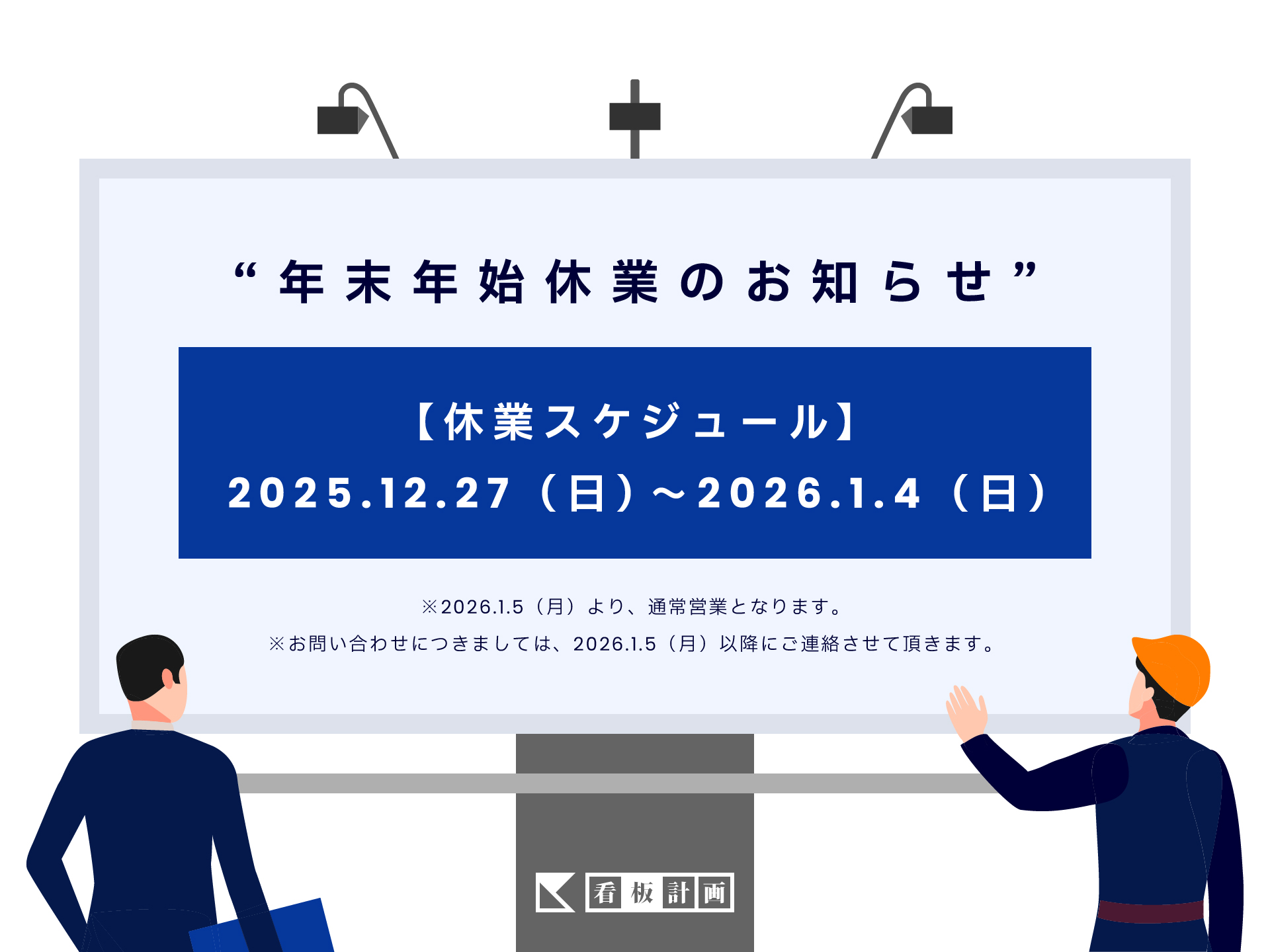 さて、看板計画では年末年始の休業日につきまして、下記のとおり休業日とさせていただきます。皆様には大変ご迷惑をおかけいたしますが、ご了承いただきますようお願い申し上げます。